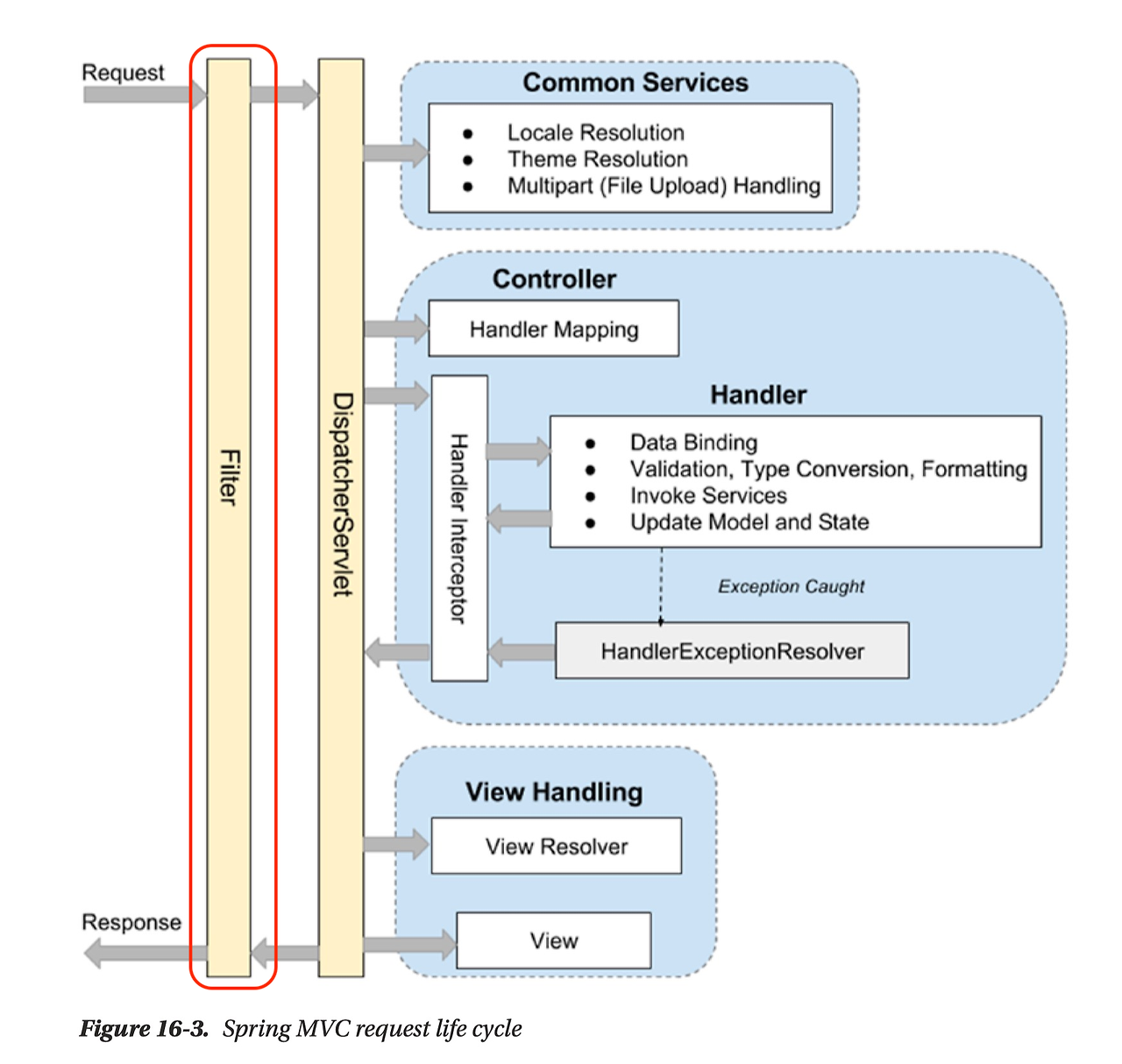 Filter: Web 애플리케이션에서 관리되는 영역으로 요청과 응답에 대해 최초/최종 단계의 위치하며 이를 통해 요청과 응답의 정보를 변경하는 등 부가적인 기능을 추가할 수 있습니다.주로 범용적으로 처리해야 하는 작업들, 예를들어 로깅 및 보안 처리에 활용합니다.인증, 인가와 관련된 로직들을 처리할 수도 있습니다.Filter를 사용하면 필터 내 로직을 비즈니스 로직과 분리하여 관리할 수 있다는 장점이 있습니다. Filter는 한 개만 존재하는 것이 아니라 여러 개가 Chain 형식으로 묶여서 처리되고 있습니다. Request URL Logging 필터import java.io.IOException;@Slf4j(topic = "LoggingFilter")@Component@Order(1)public c..